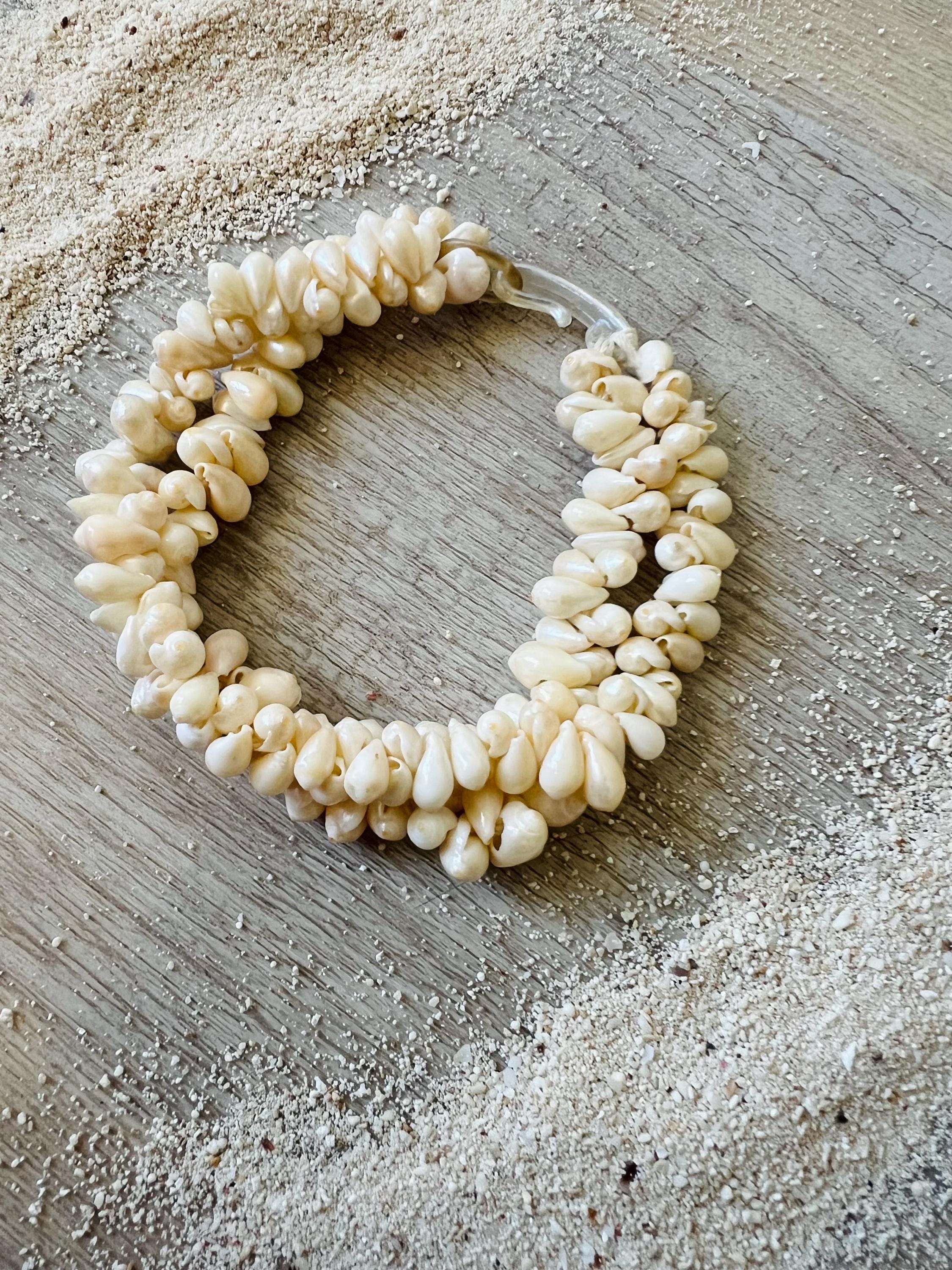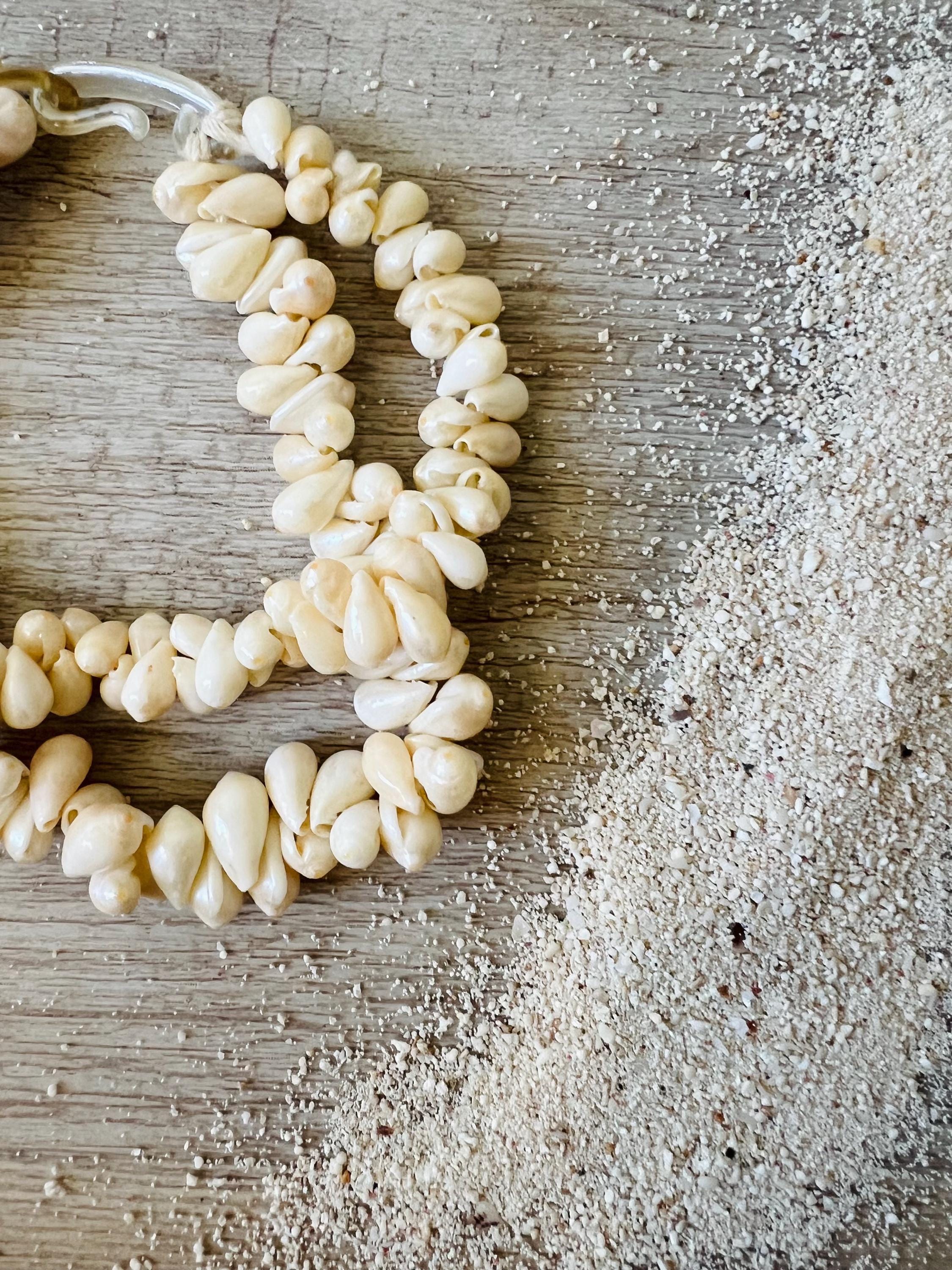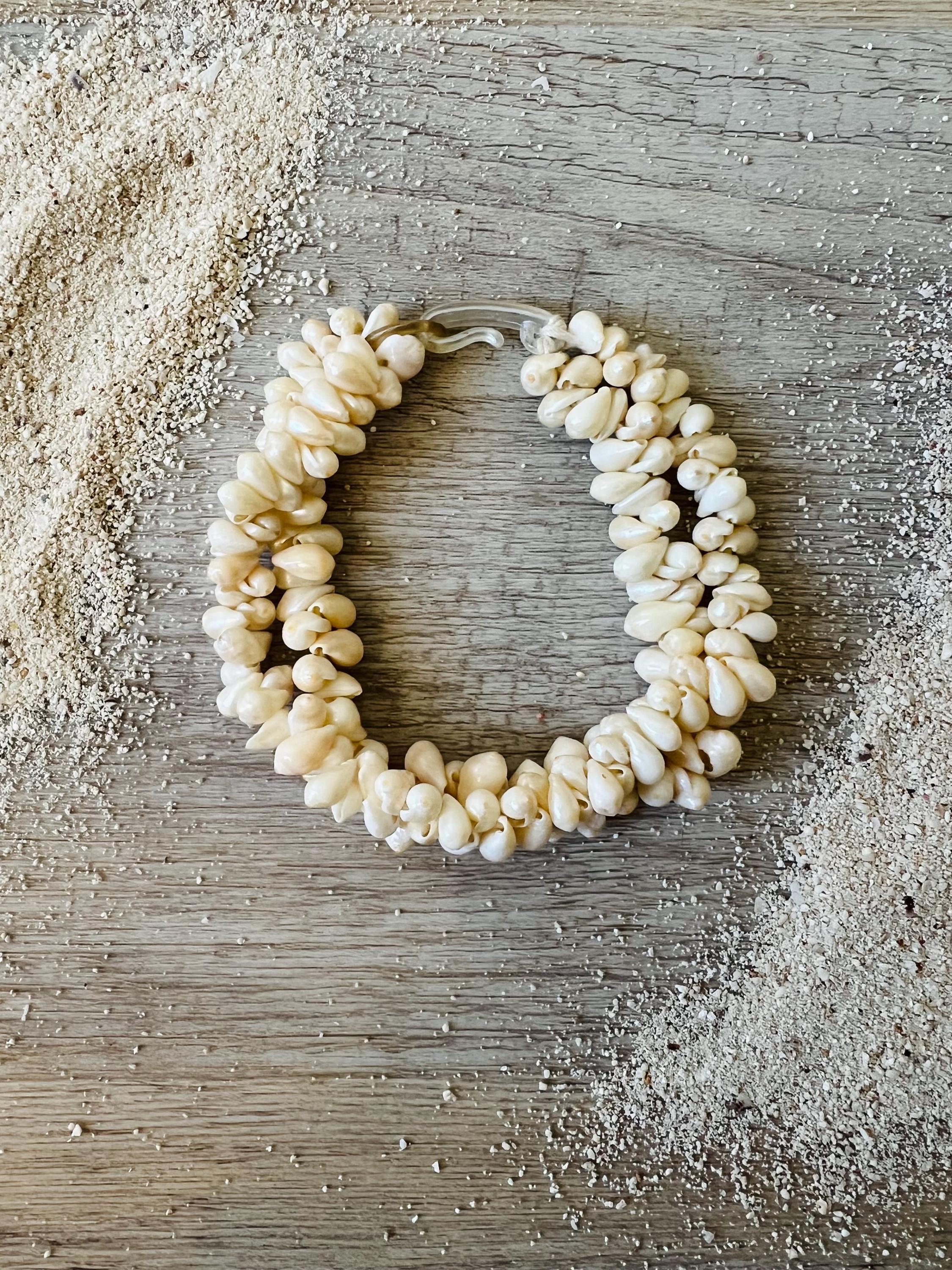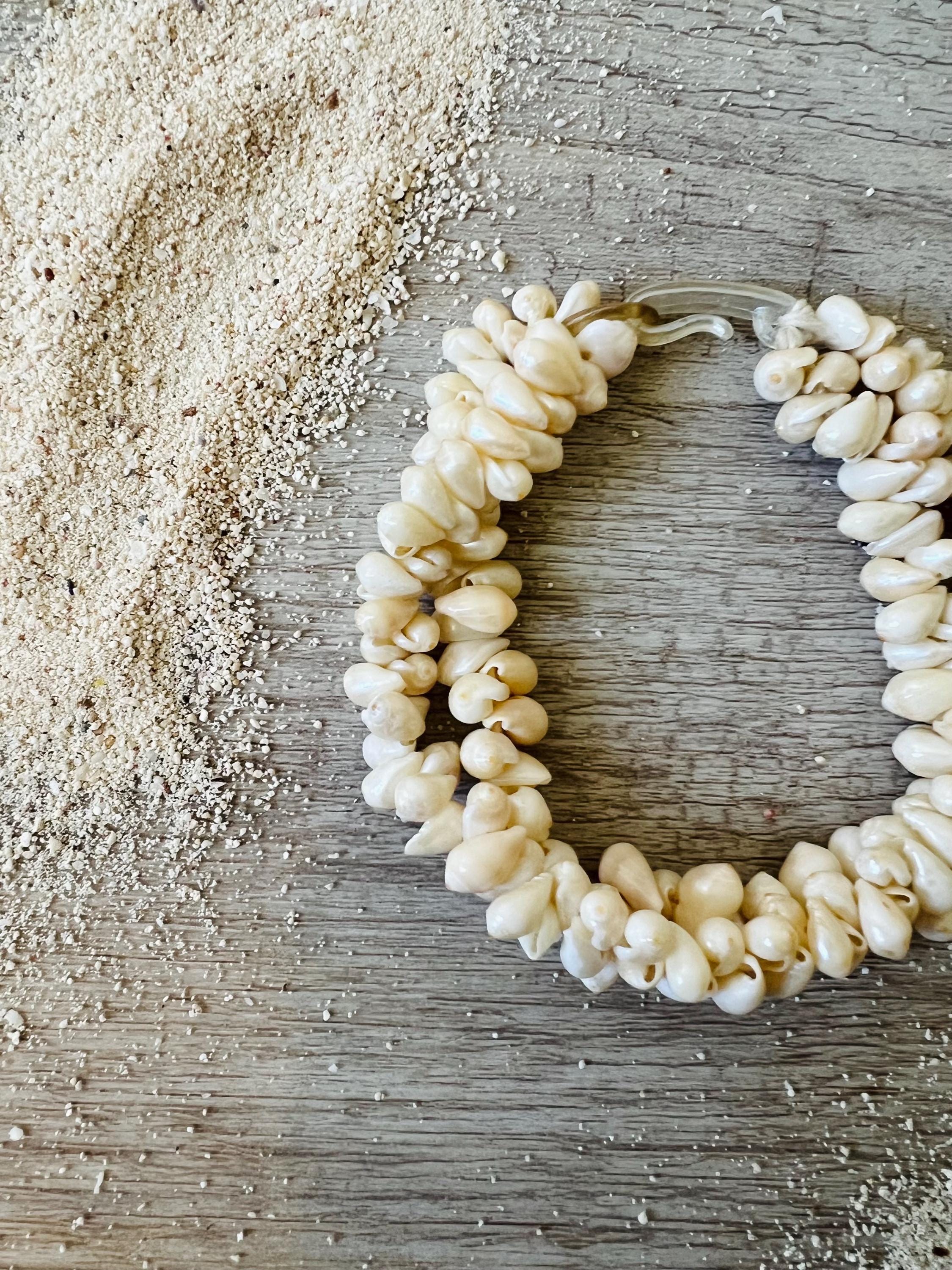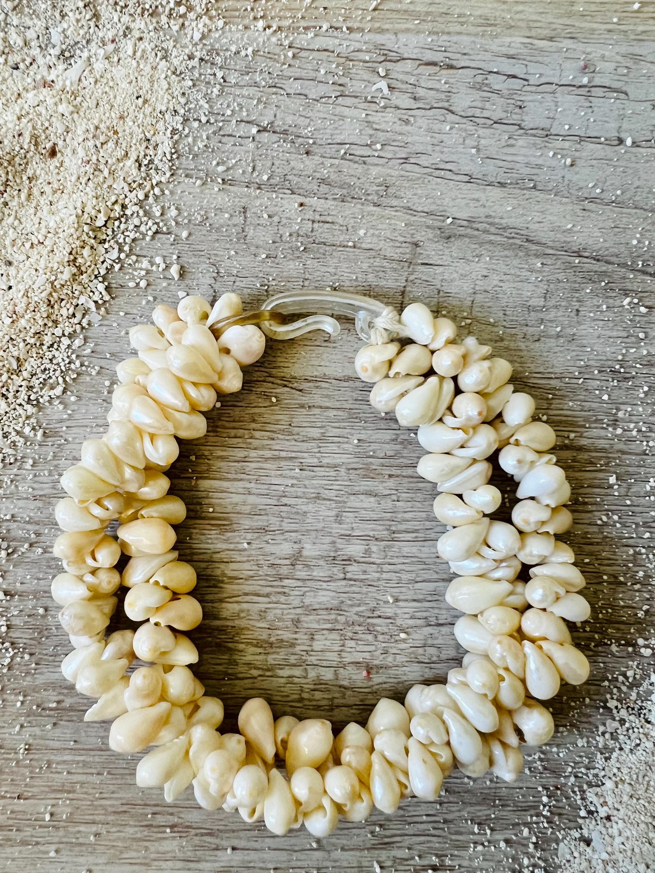This vintage statement bracelet features a lush, double strand cluster of genuine creamy-white seashells, expertly woven to create a chunky, textured silhouette that feels both earthy and elegant.