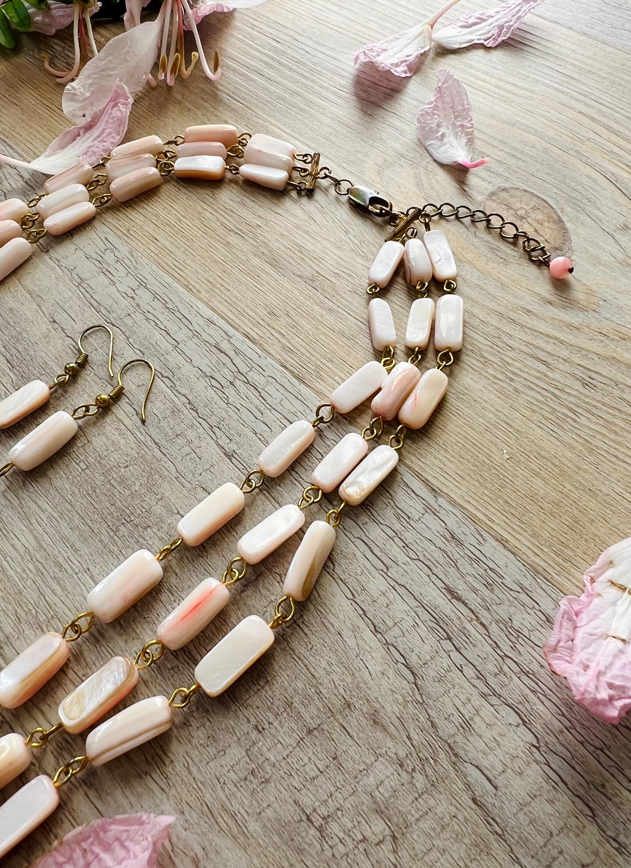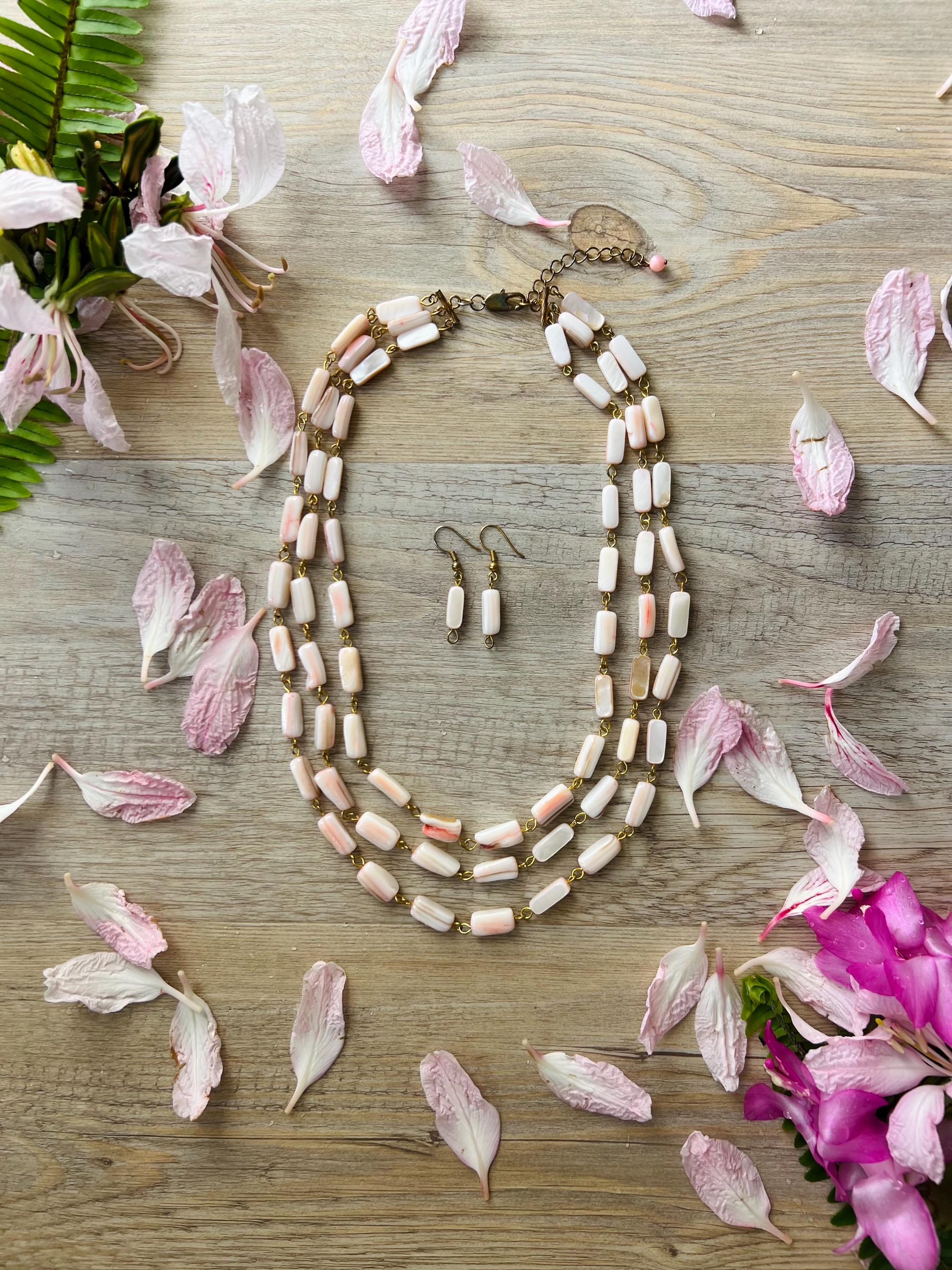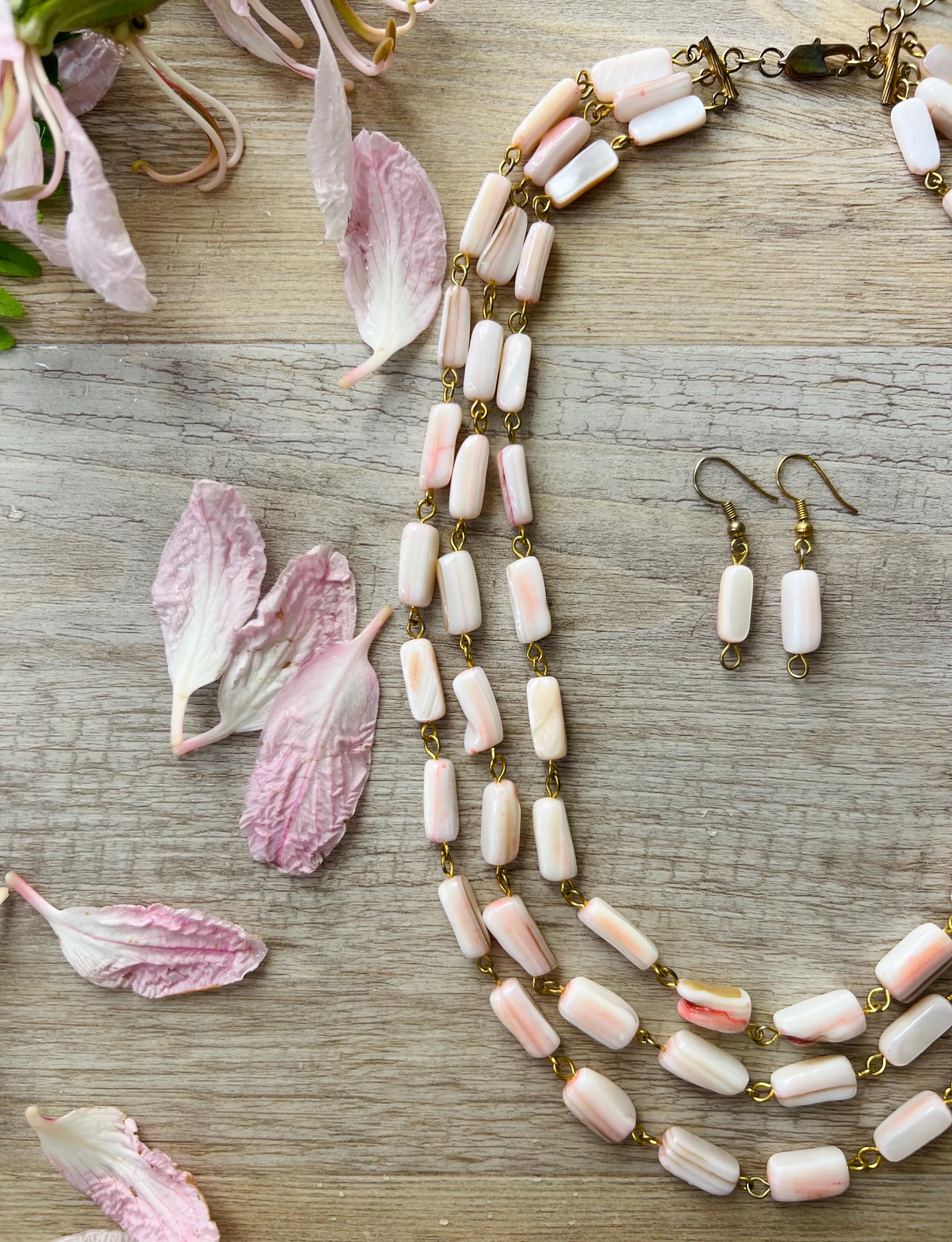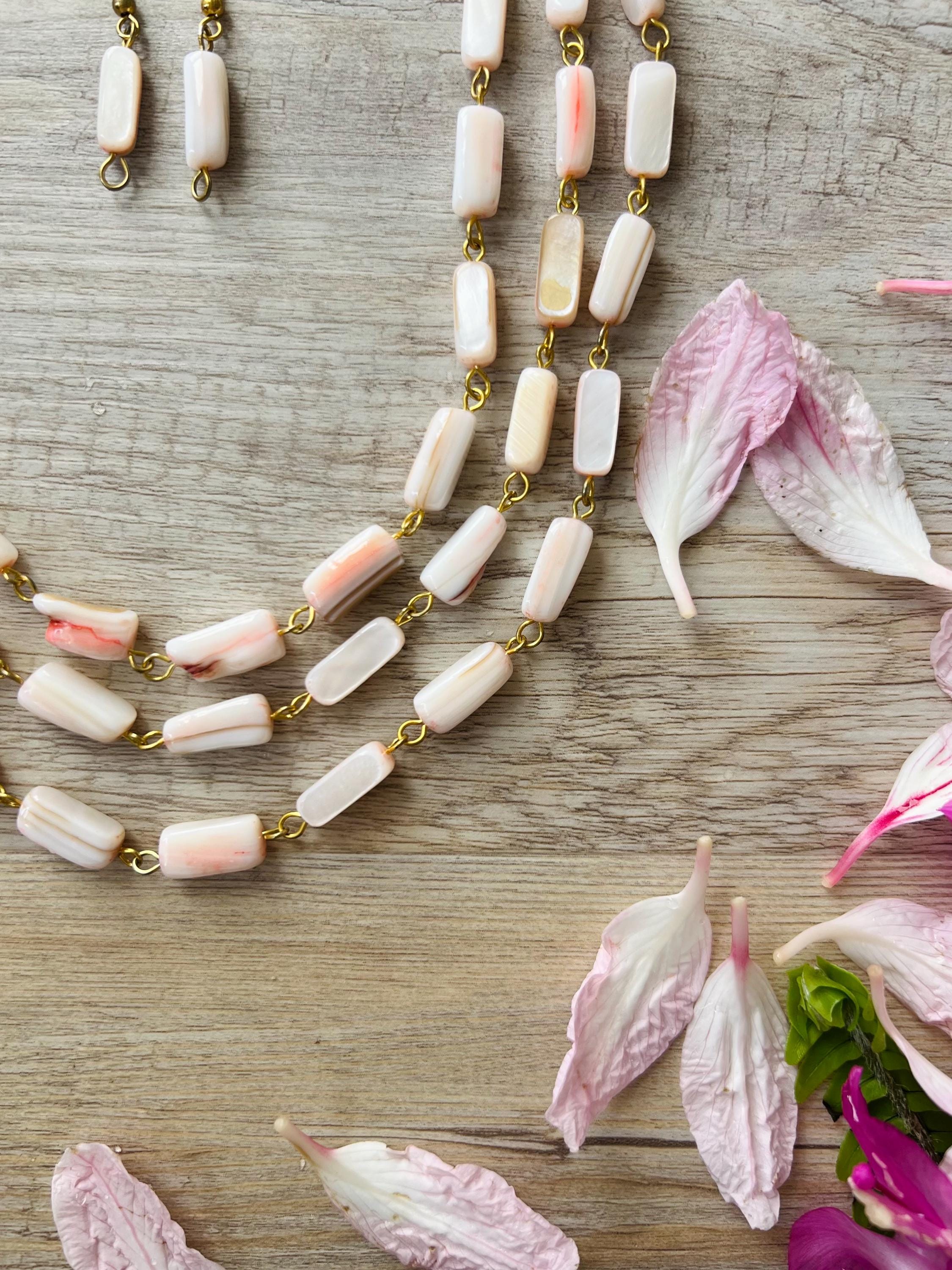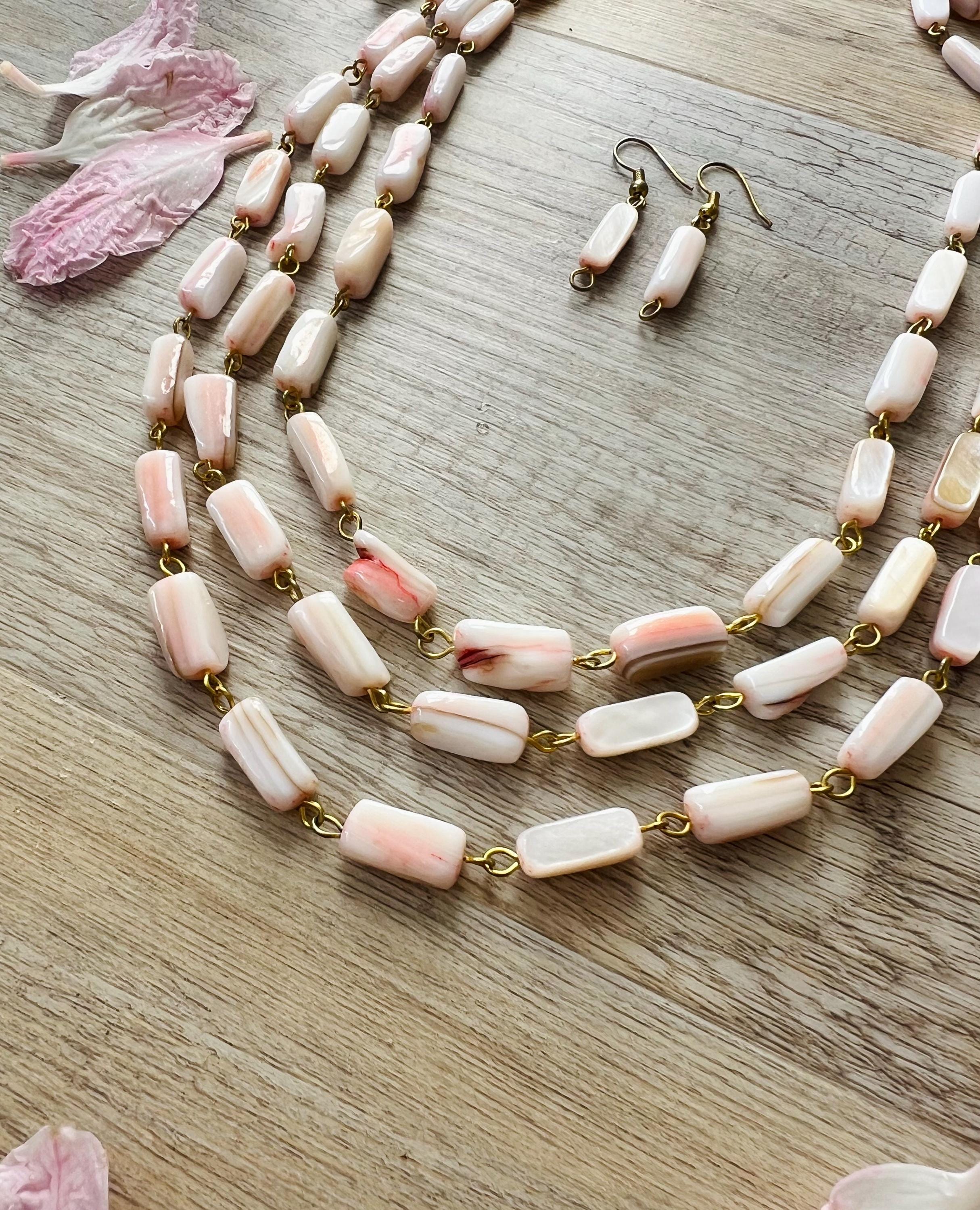 Blush Pink Stone Necklace & Earring SetNecklace length 23”-25”Earring length 1”Three-tier blush stone necklace featuring gold accents and coordinated earrings