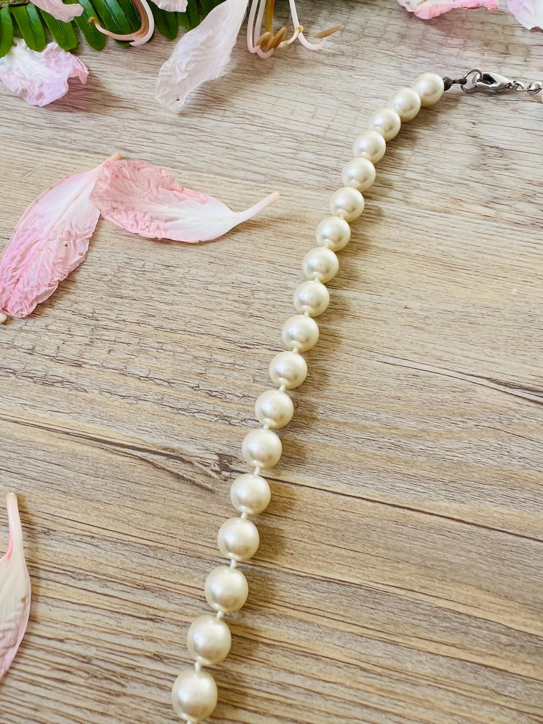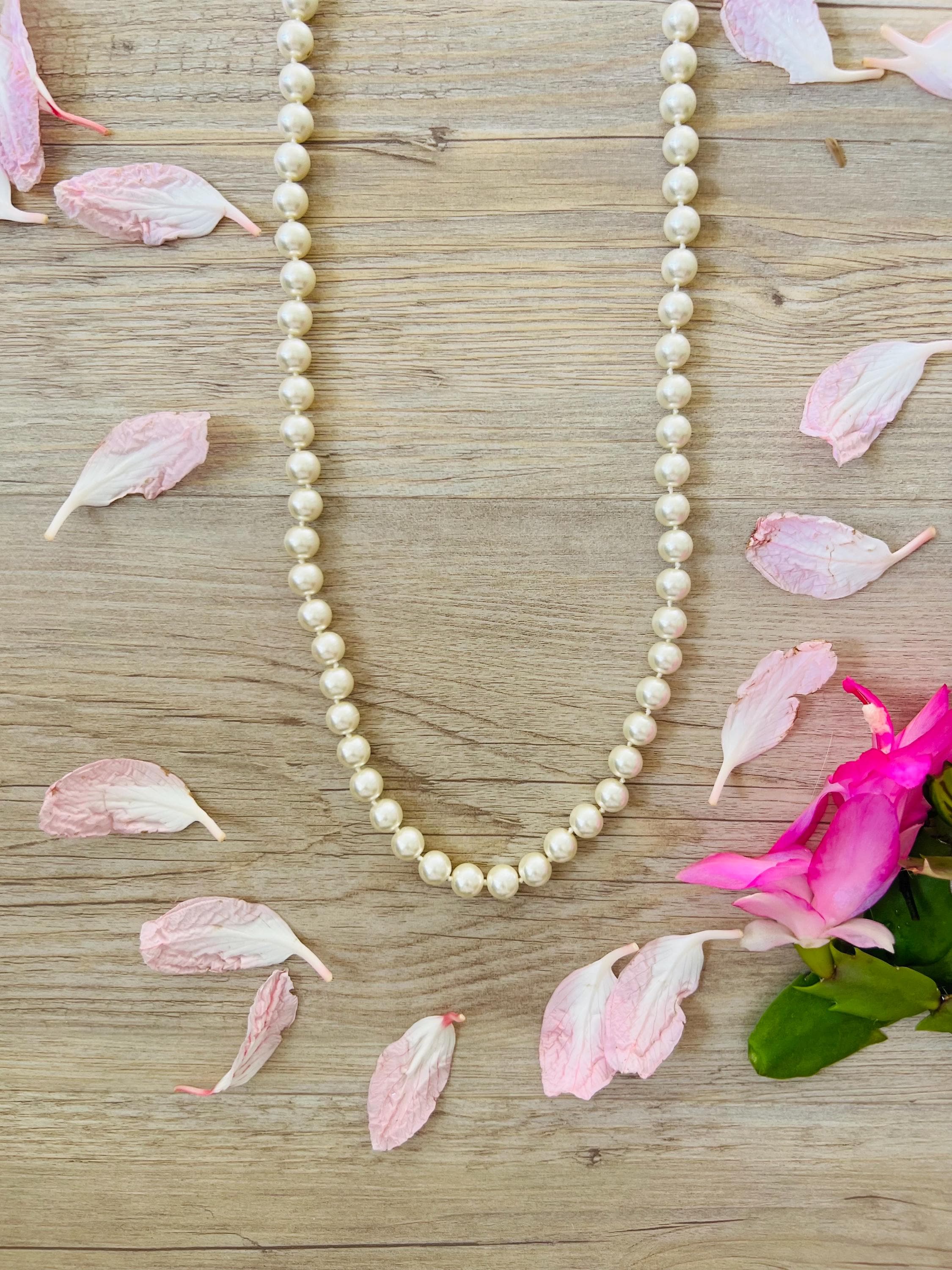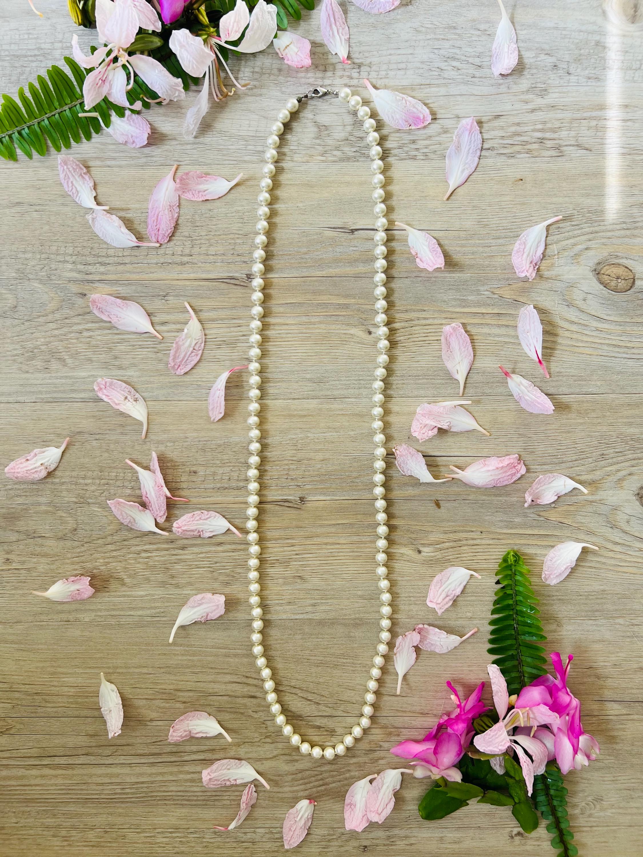 Long White Pearls Length 37”mid-length faux pearl necklace featuring smooth, cream-colored beads with a classic luster and a beautiful natural weight and feel.