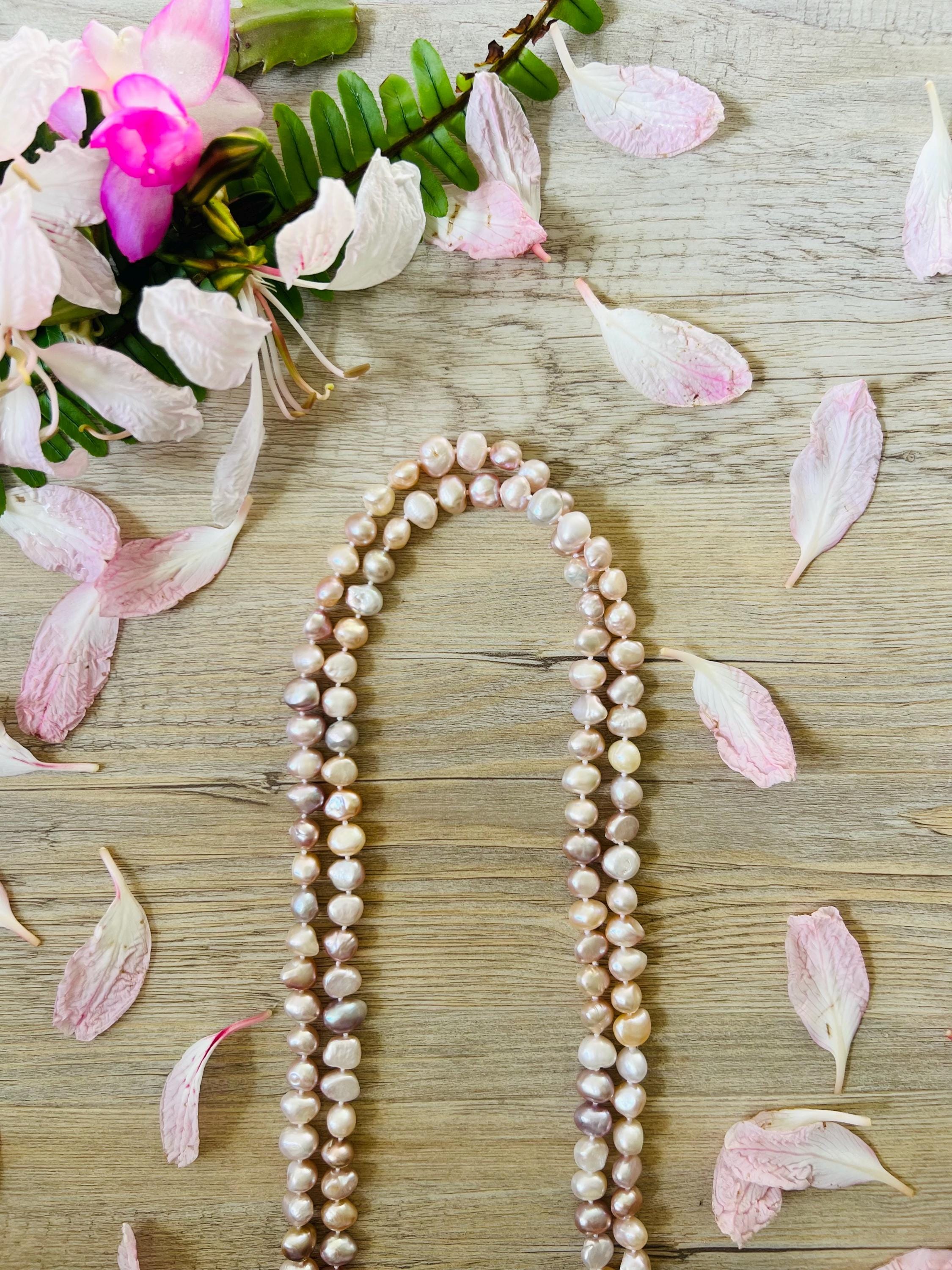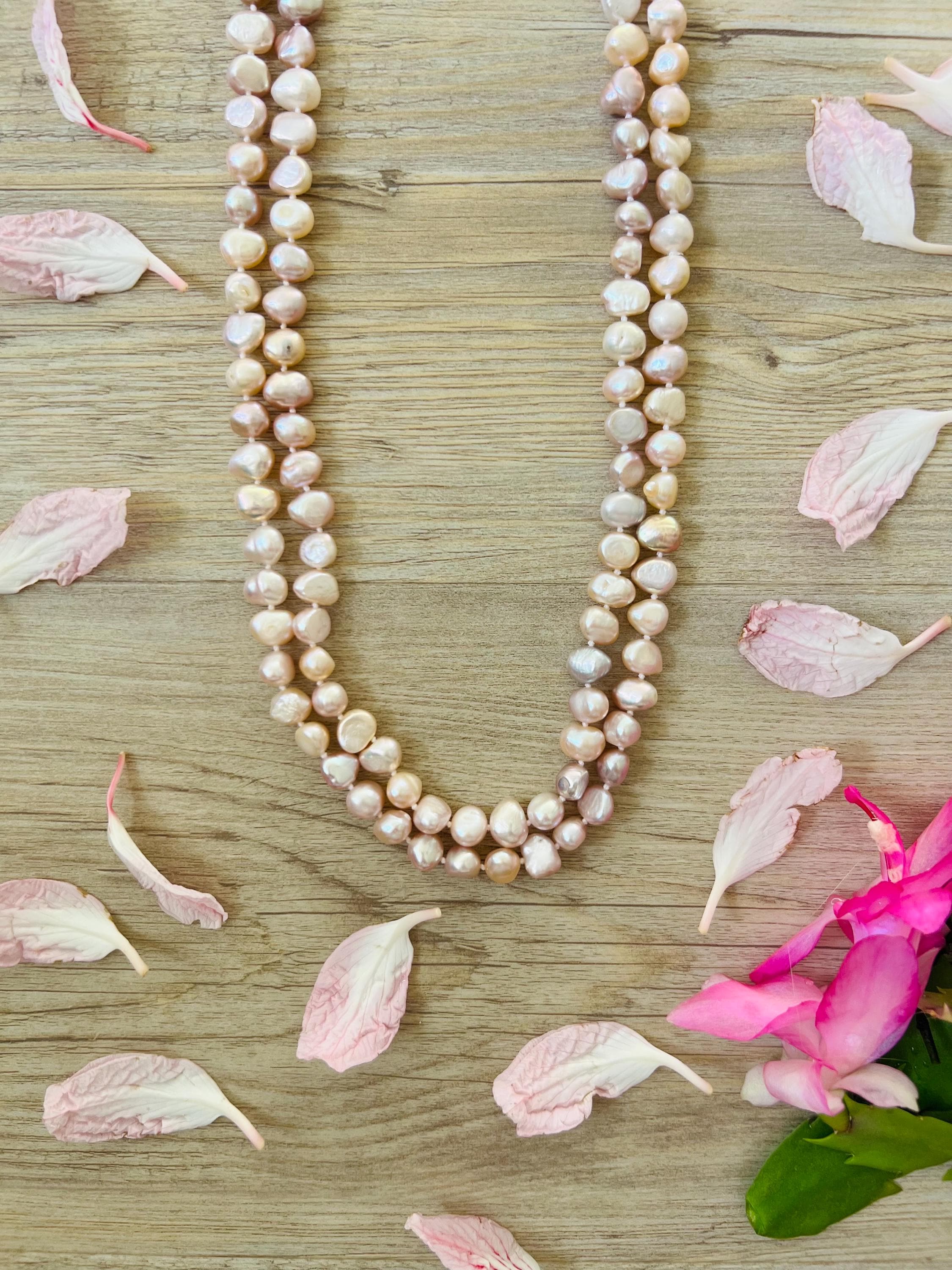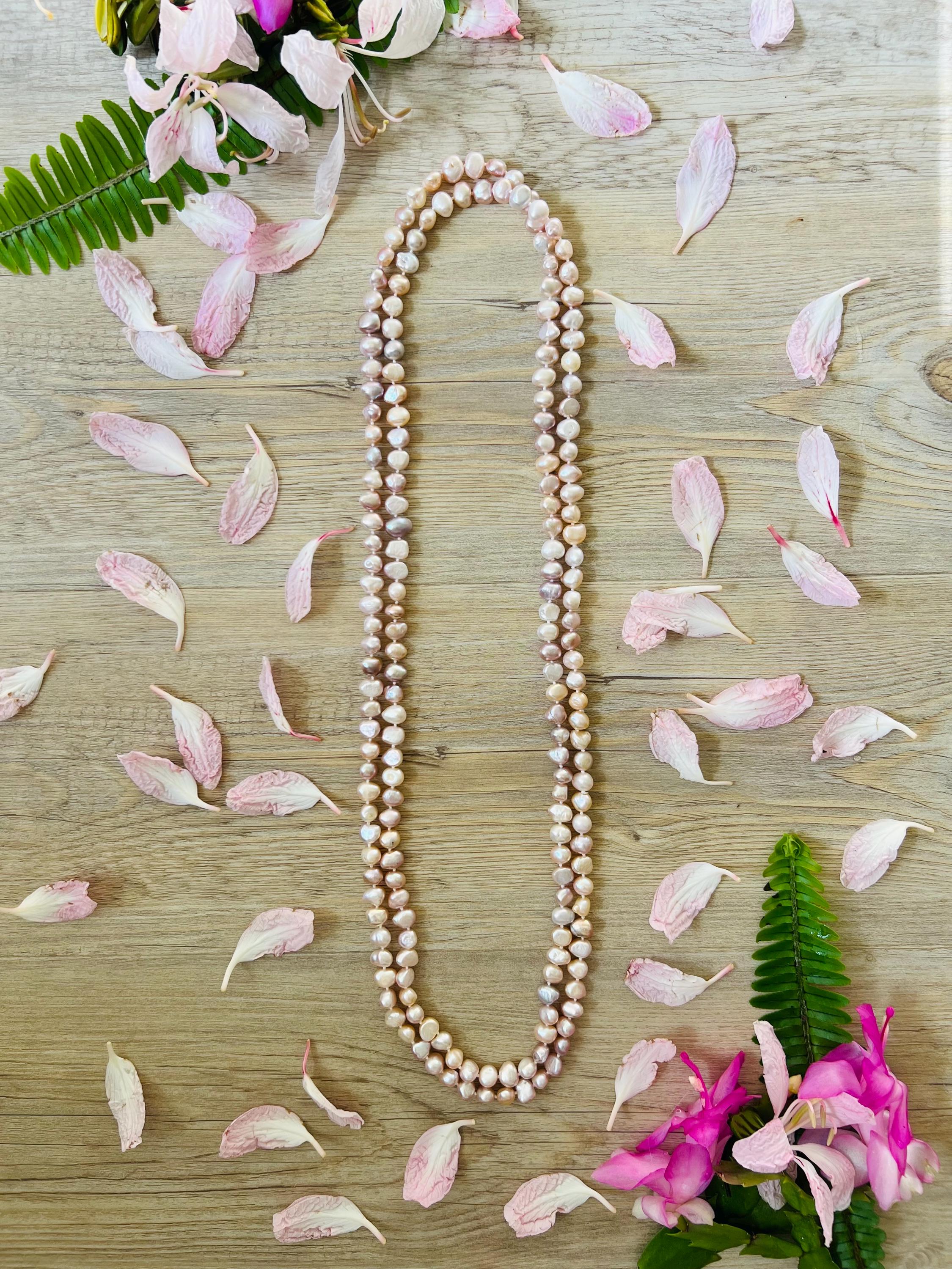 Long Blush Pink Pearls Length 62” longExtra-long strand of blush-toned faux pearls features a beautiful luster and a natural weight and feel.