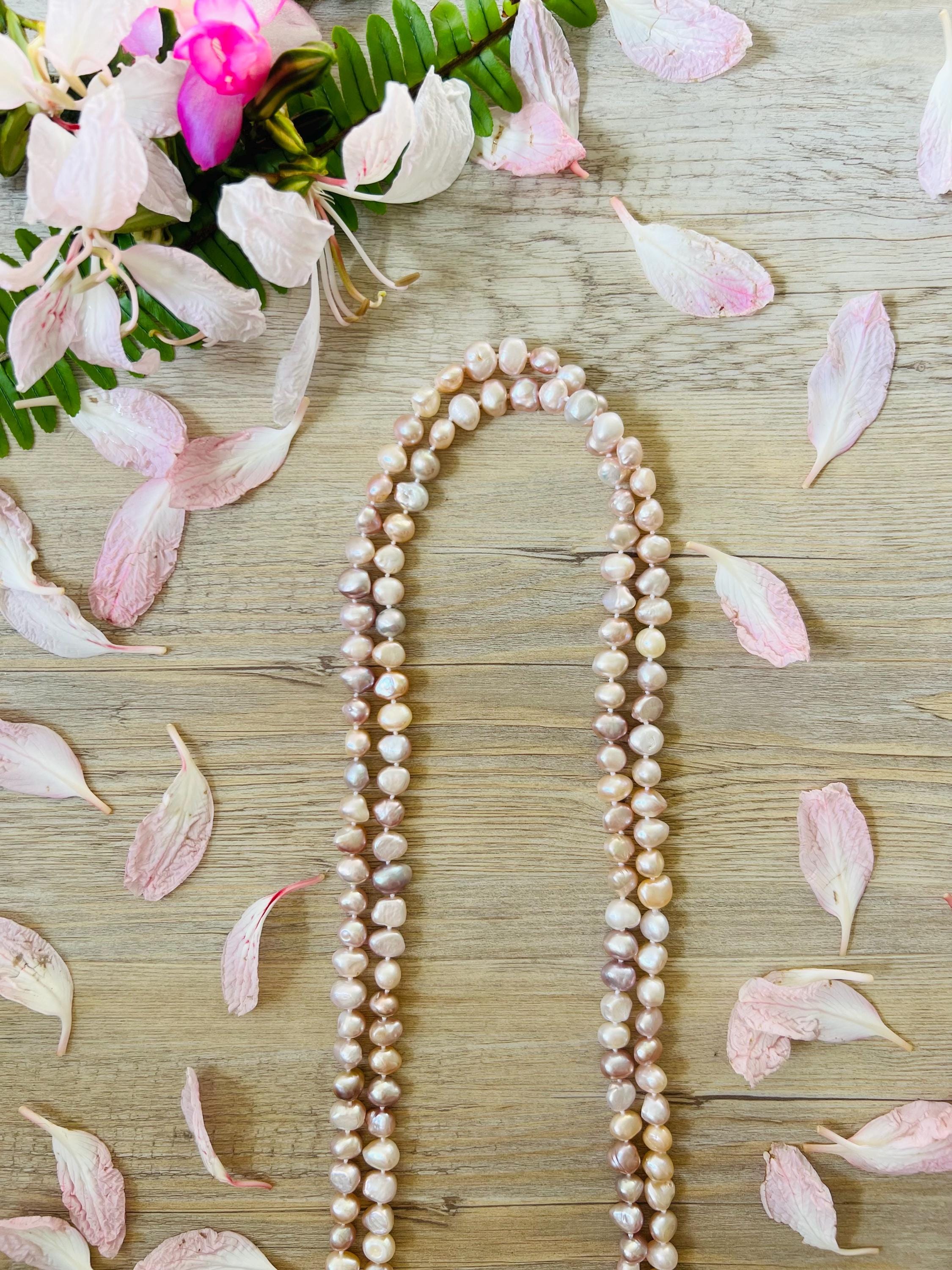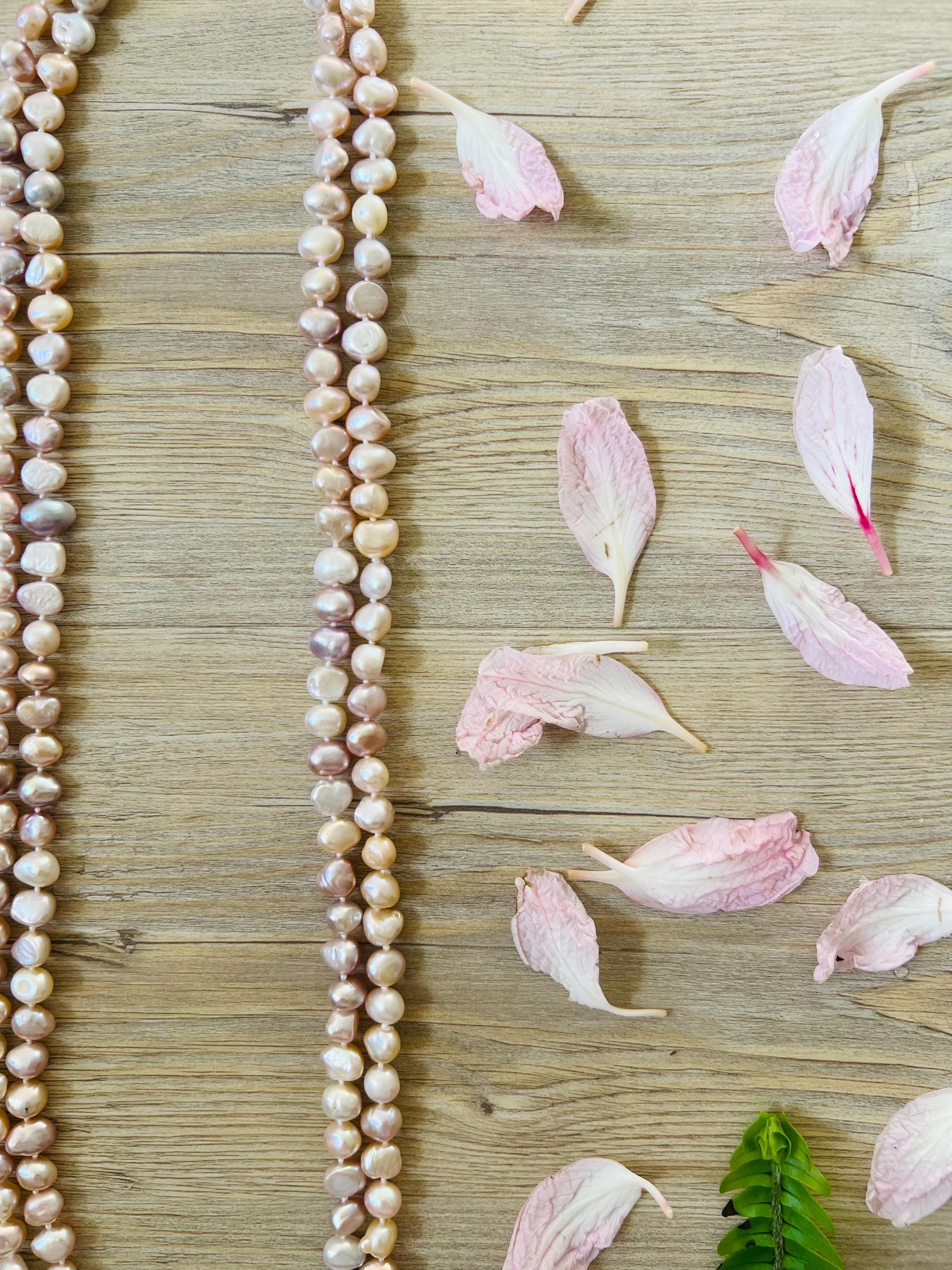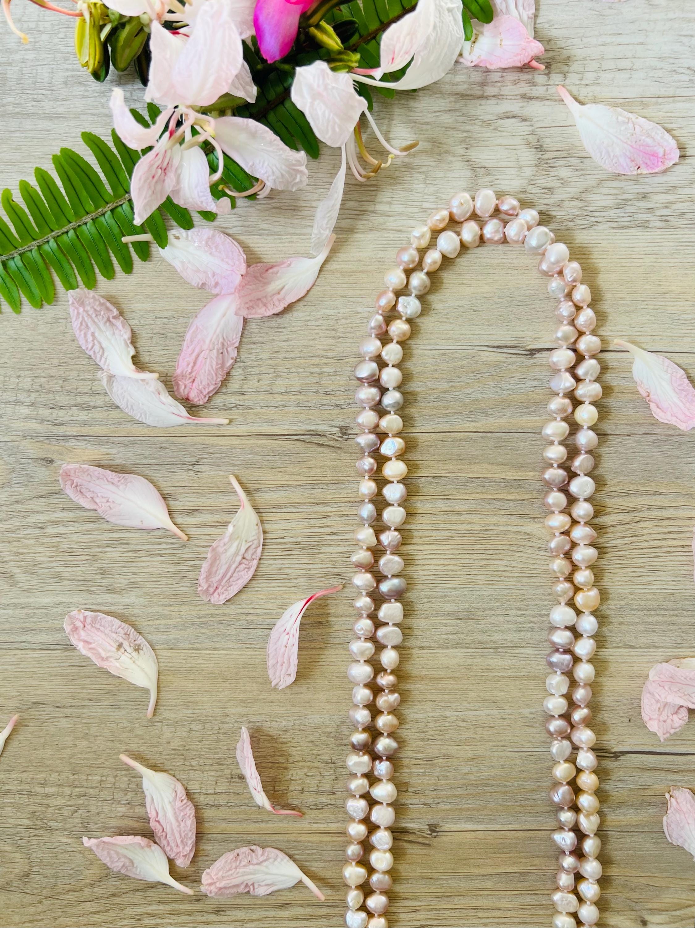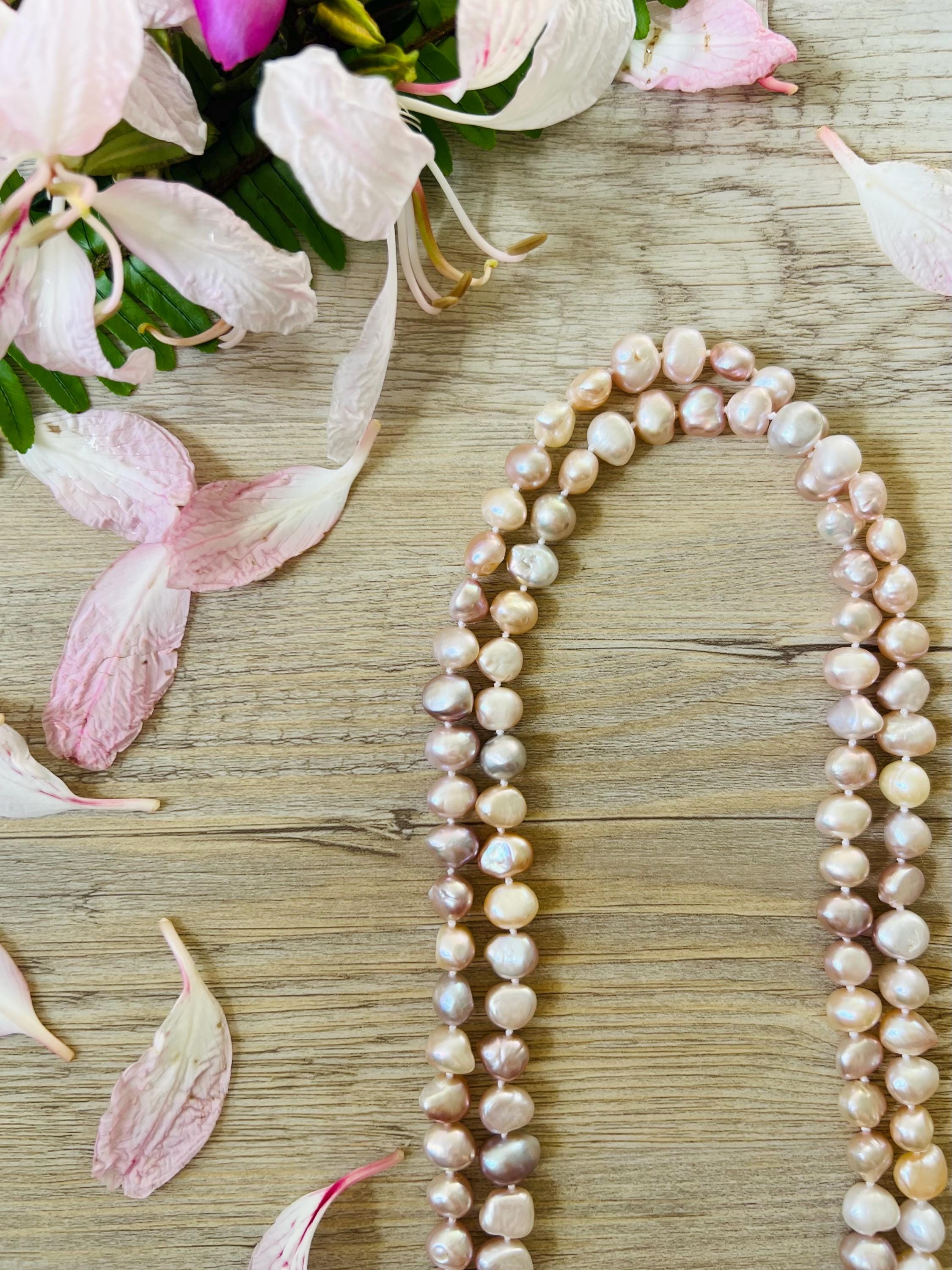 Long Blush Pink Pearls Length 62” longExtra-long strand of blush-toned faux pearls features a beautiful luster and a natural weight and feel.