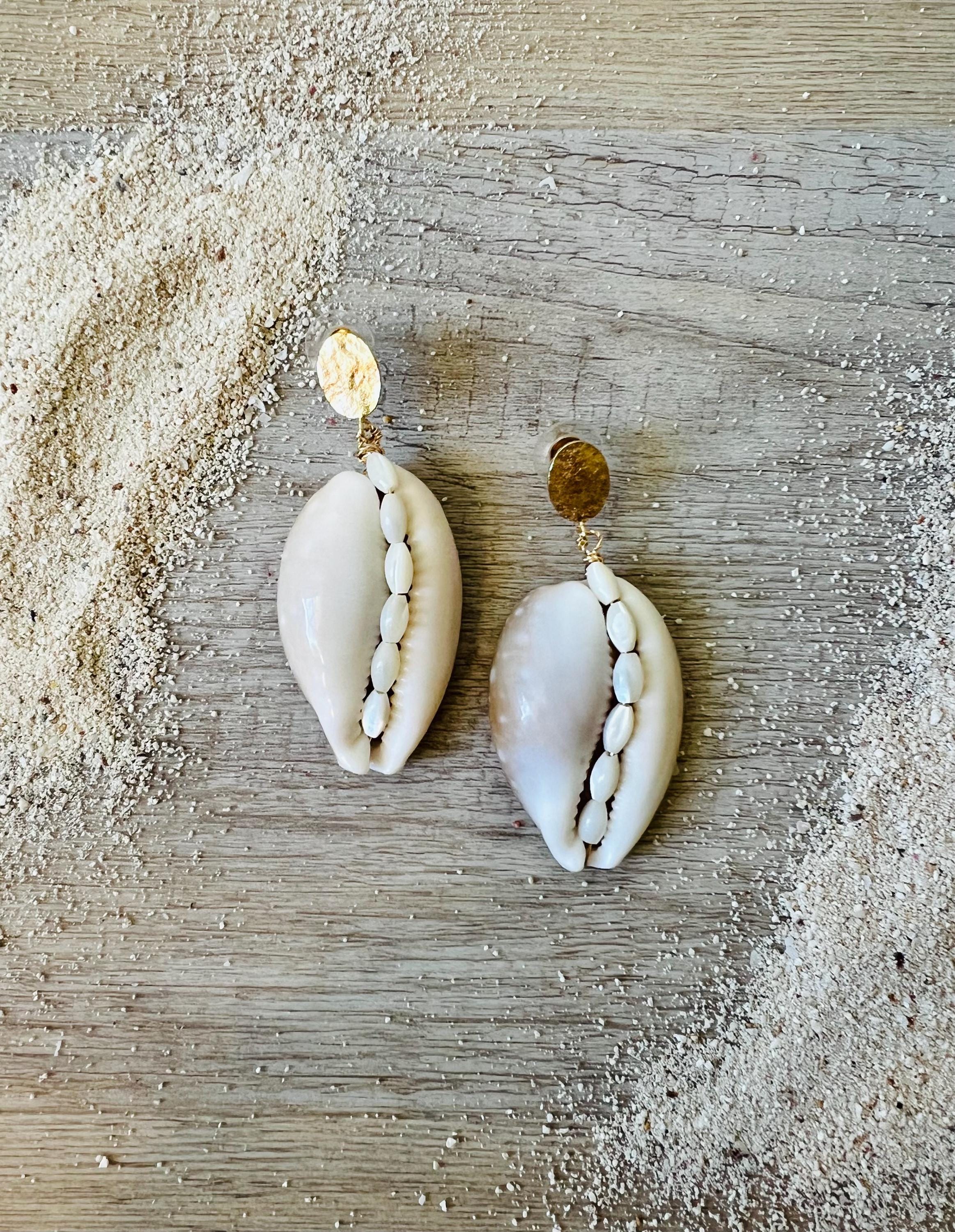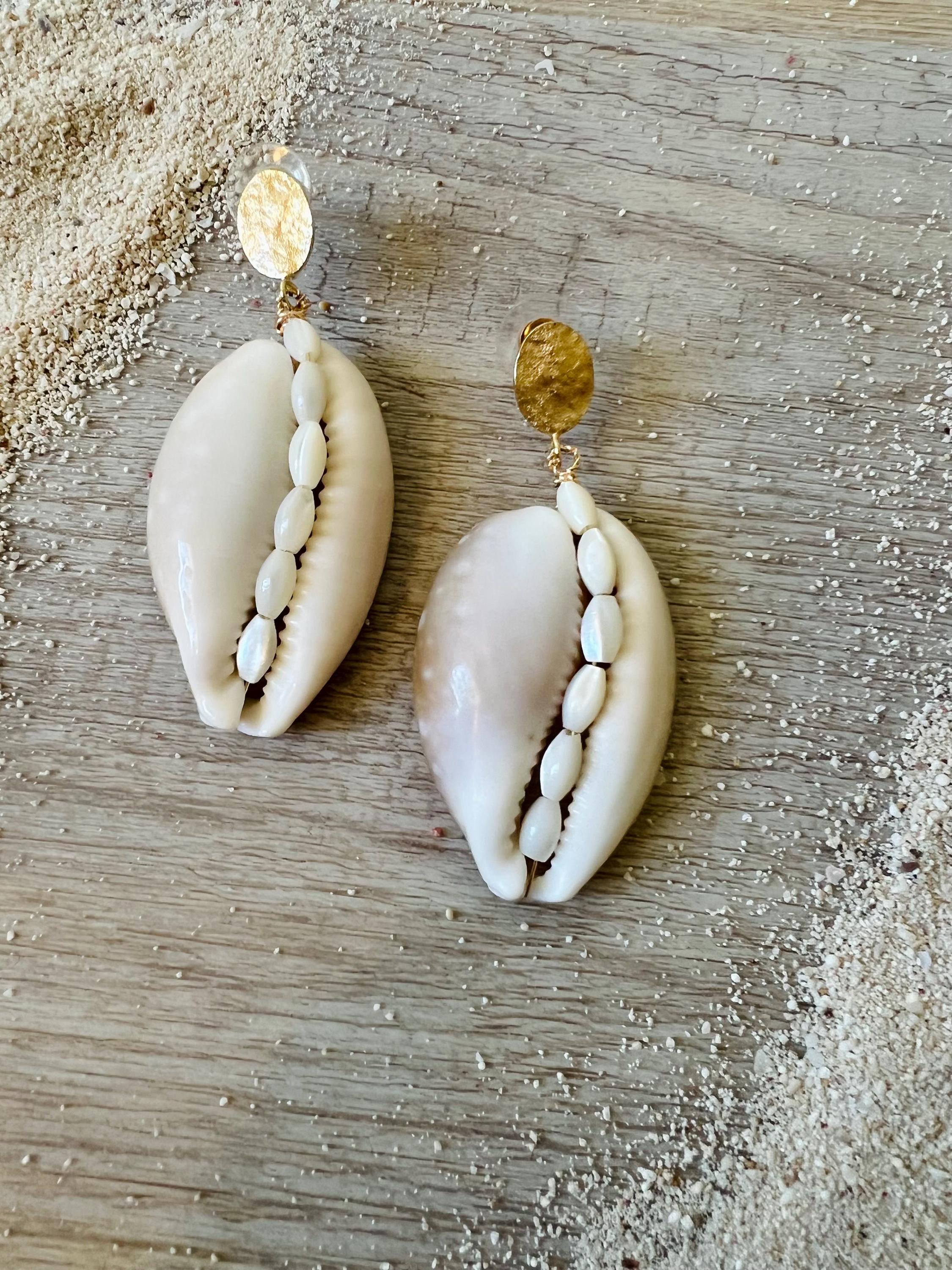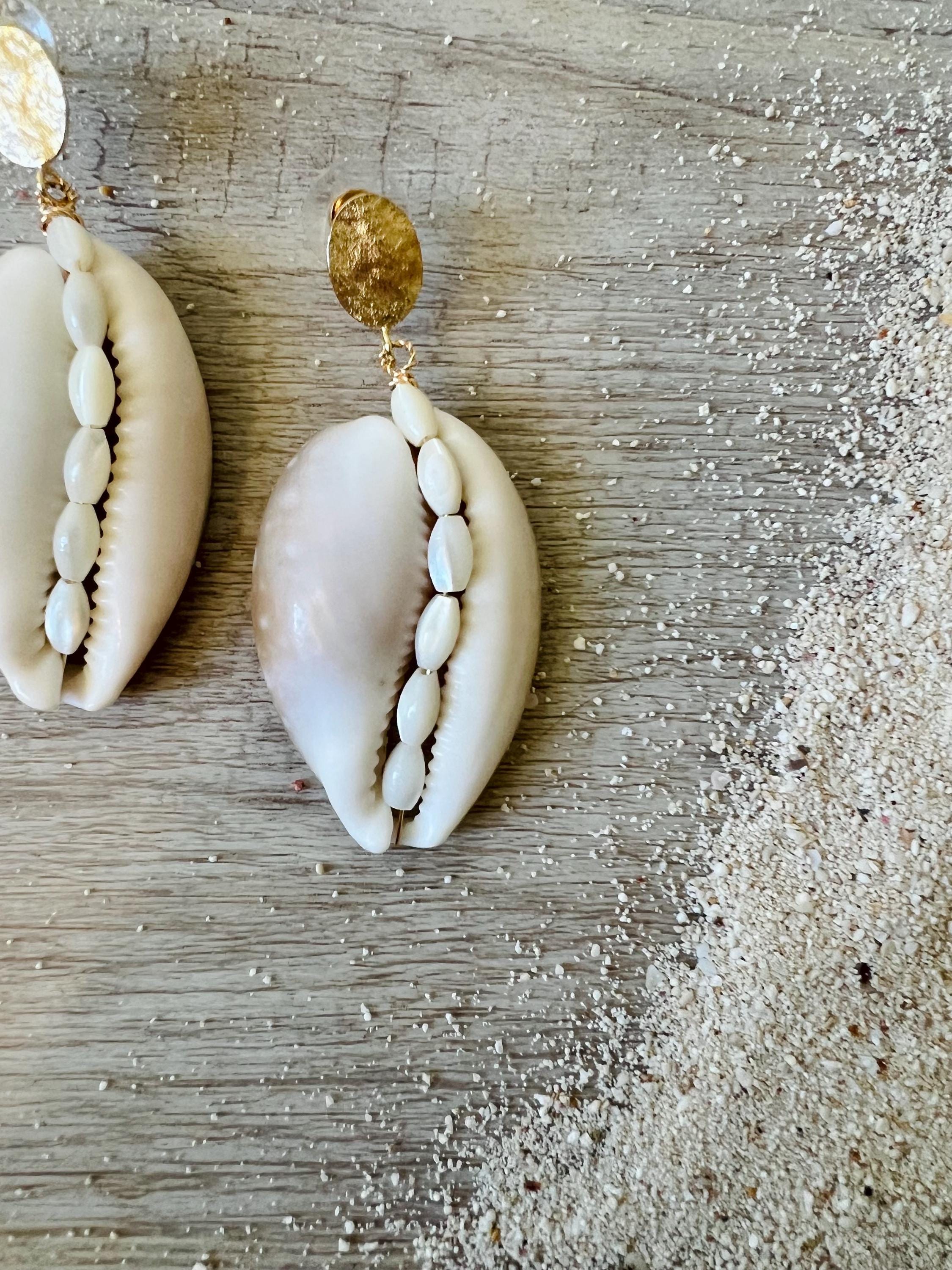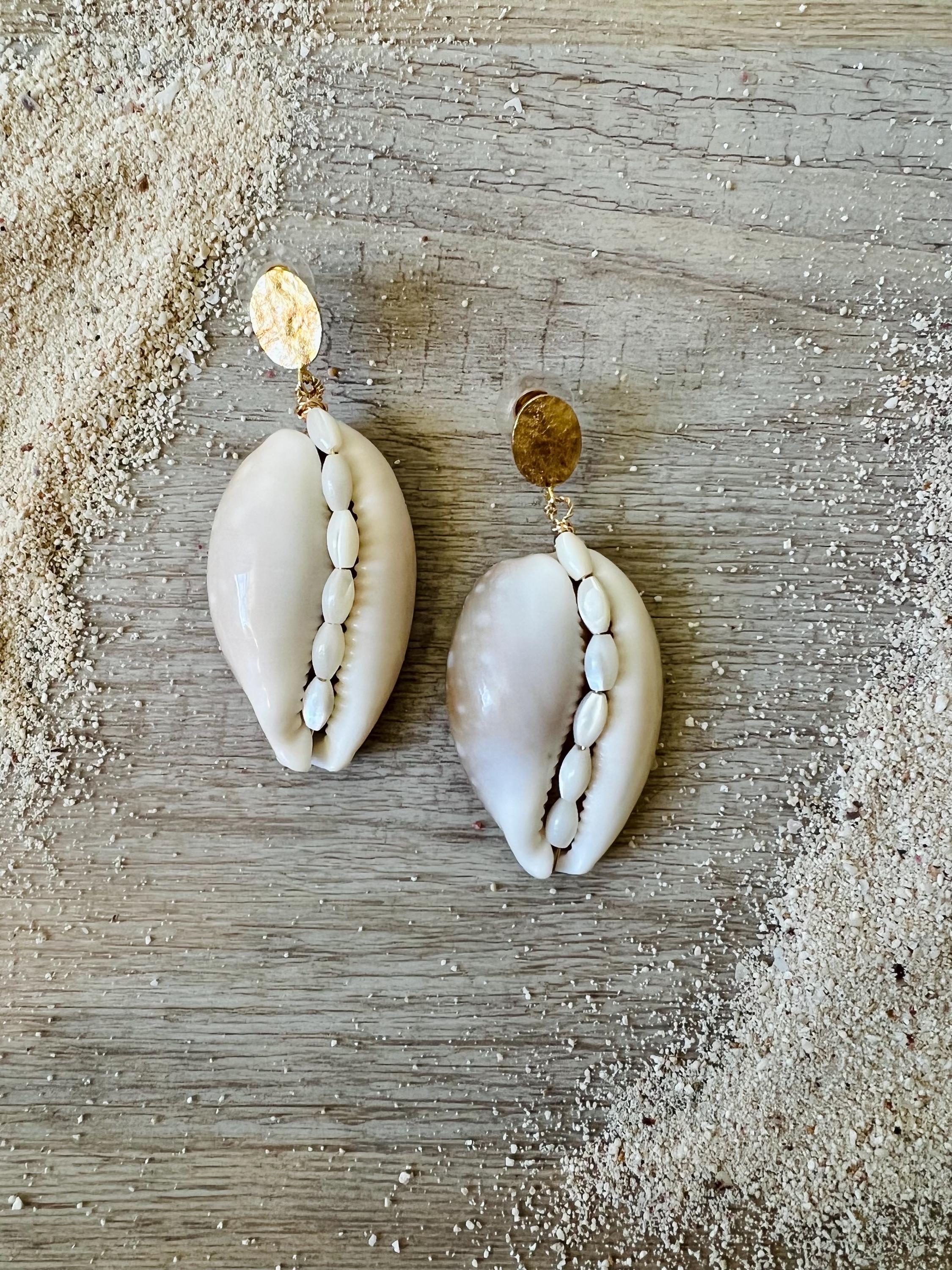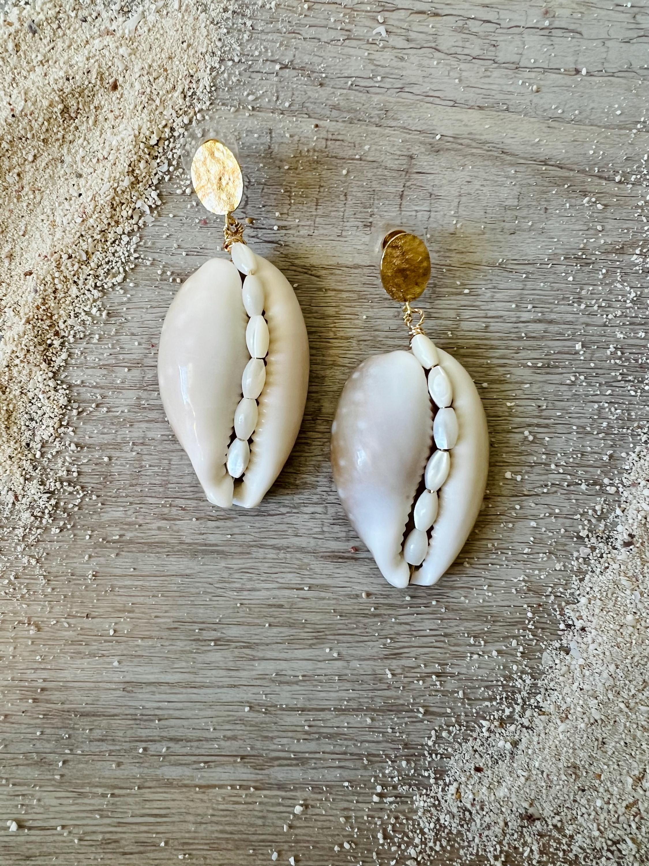 Elevate your bridal style with these stunning statement earrings. Handcrafted from unique, oversized cowrie shells, each piece features an intricate inlay of vintage seed pearls running down the center. Suspended from 18k gold-plated hammered oval disks, these earrings offer a luxurious touch to your island wedding attire. Despite their bold look, they are incredibly comfortable and lightweight, weighing only 0.5 oz. *Lead and nickel free*